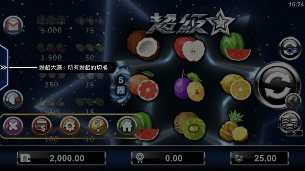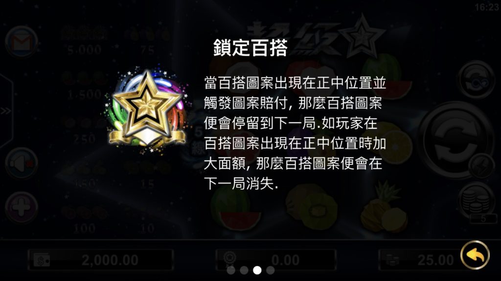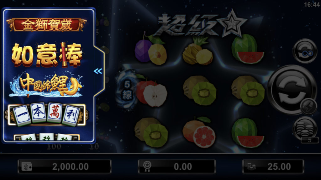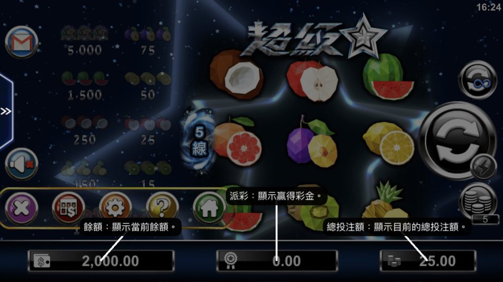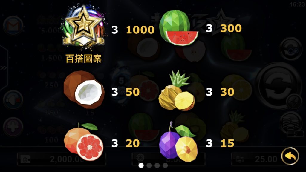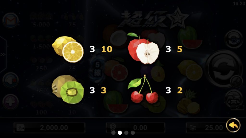 經典水果造型組合,特殊玩法連續百搭星星,連續中得彩金無極限。