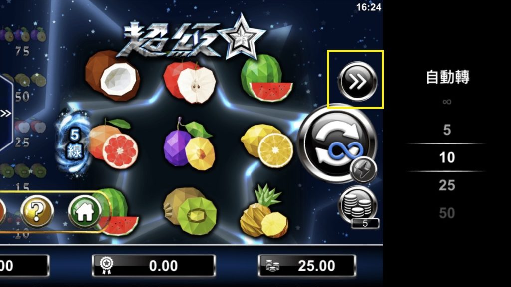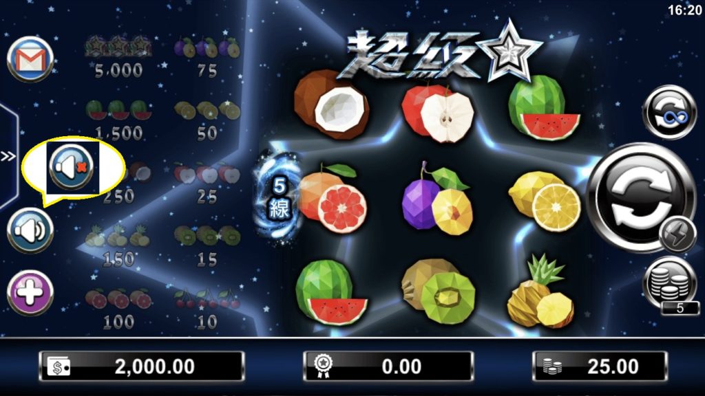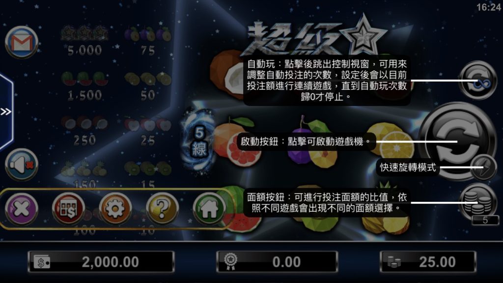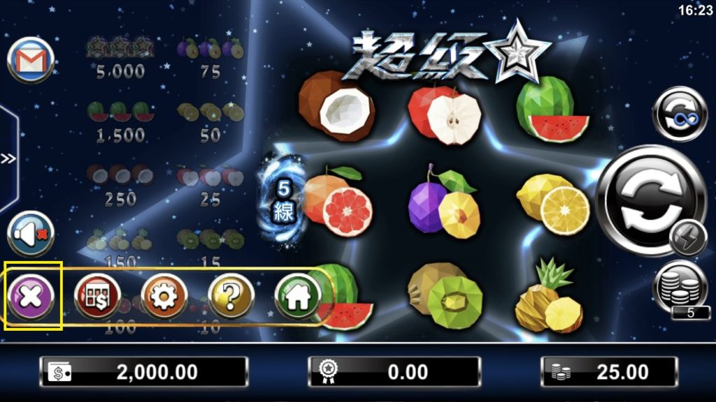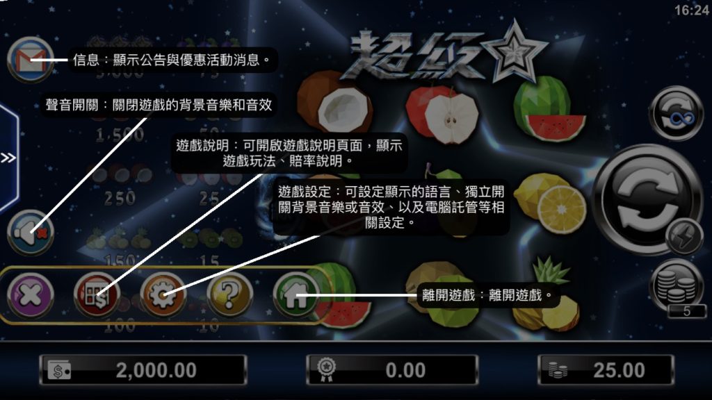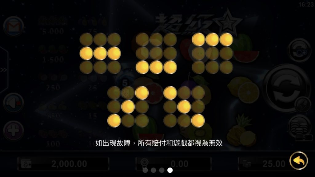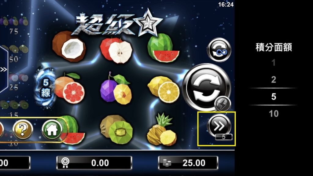 經典水果造型組合,特殊玩法連續百搭星星,連續中得彩金無極限。