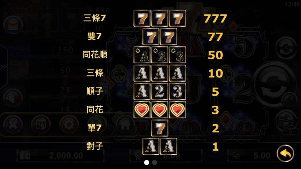 依照賠率表三7、雙7、同花順 、三條、順子、同花、單7、對子這樣由大到小~是不是很簡單又好懂呢^^