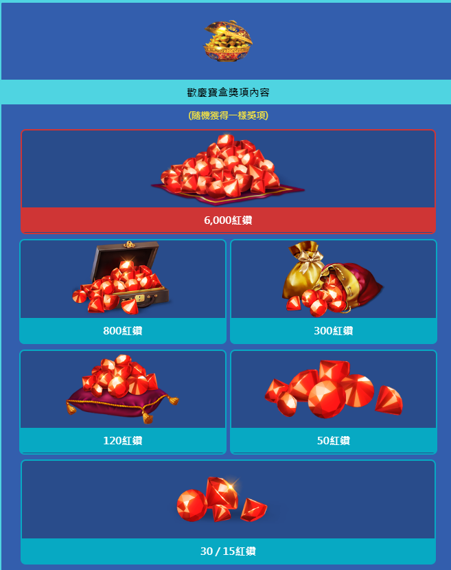 這次的寶箱獎勵有七種,6000/800/300/120/50/30/15,共七種獎項,看看那個最大獎,6000紅鑽阿,想想都覺得口水直流,這還不趕緊手刀去儲值!!