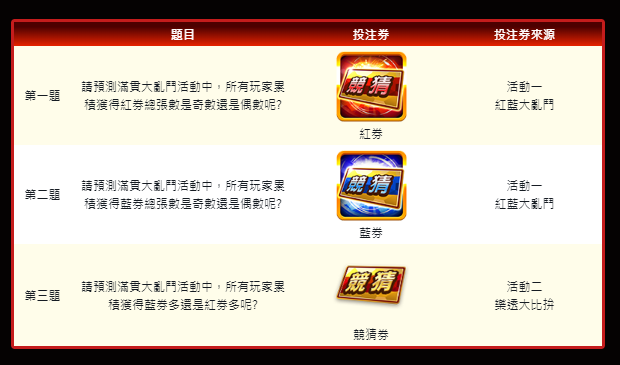 最後一種競猜卷則是預測最後是紅多還是藍多唷!至於如何拿到競猜卷~就請玩家們遊戲公告看囉!