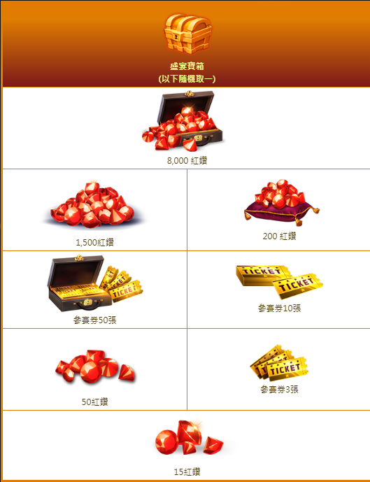 活動期間內,使用MyCard、FunPay儲值300/500/1,000品項即可獲得旺盛節系列禮包,500/1,000品項可再取得盛宴寶箱碎片。