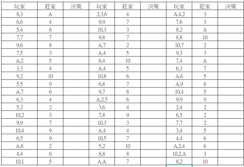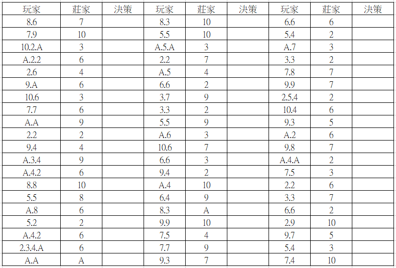 基本策略決策練習:下表我列出許多玩家手牌跟對應莊家的面牌,參考你在第一課所學的基本策略表先做一份標準答案放著,然後另外列印一張開始作答,並用標準答案來檢查正確性,目標是2分鐘內完成並且達到100%正確。