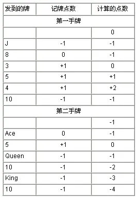 簡單的認為,10點以上的牌記為-1(減1),3到6的牌記為+1(加1),剩餘的牌為可以忽略為0。下面是兩手21點牌的記牌法例子。