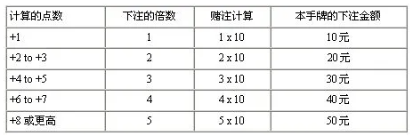是基於計算的點數來逐漸調整下注,隨著贏率的提高下大賭注。以下是根據不同的計算的點數來下注的例子(基於10元錢一注)